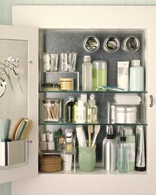 Great bathroom cabinet storage - magnetic containers adhere to the sheet metal backing the cabinet and small tools hang from hooks inside the door.