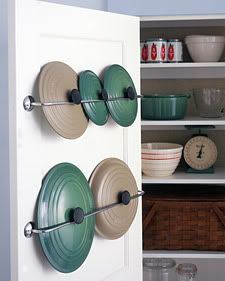 Towel rails make ingenious pot lid storage inside a cupboard door.